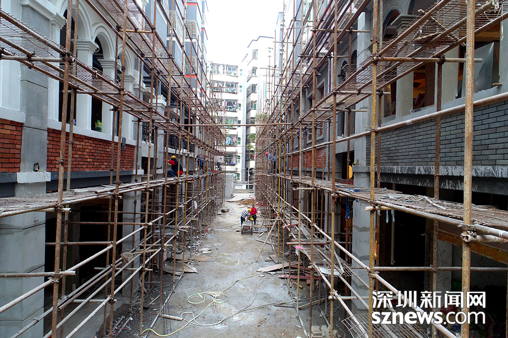 12月14日下午,水圍村改造的村民房的建筑鋼架還沒(méi)有拆除,建筑工人正在對(duì)外立面進(jìn)行粉刷