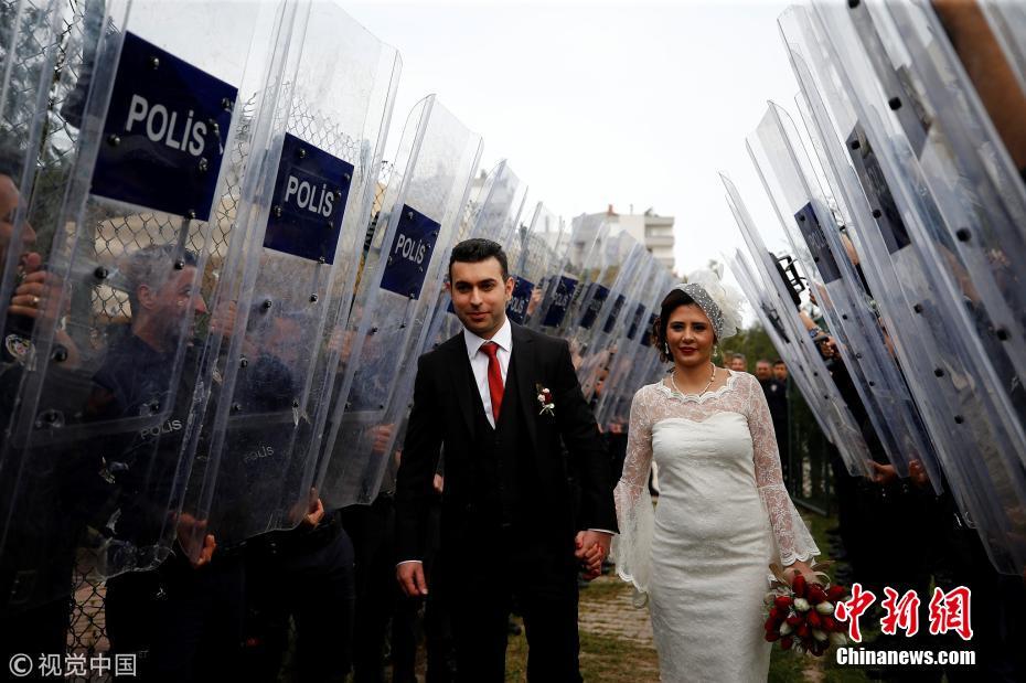 當(dāng)?shù)貢r(shí)間2018年3月21日,土耳其安塔利亞,警官Ceren Ekici和Taha YasinGul舉行婚禮。在10個(gè)月前的一次行動(dòng)中,Taha YasinGul不慎開槍擊中Ceren Ekici的頭部,所幸沒有造成生命危險(xiǎn)。他們的婚禮由警局同事操辦,同事們舉著防彈盾牌,護(hù)送這對(duì)新人走向禮臺(tái)。圖片來源:視覺中國(guó)