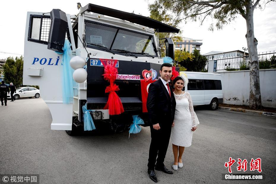 當地時間2018年3月21日,土耳其安塔利亞,警官Ceren Ekici和Taha YasinGul舉行婚禮。在10個月前的一次行動中,Taha YasinGul不慎開槍擊中Ceren Ekici的頭部,所幸沒有造成生命危險。他們的婚禮由警局同事操辦,同事們舉著防彈盾牌,護送這對新人走向禮臺。圖片來源:視覺中國