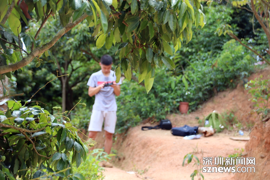 深圳新聞網(wǎng)記者正在操作無人機(jī)對羊臺山兩棟拆除后的違法建筑廢墟進(jìn)行拍攝