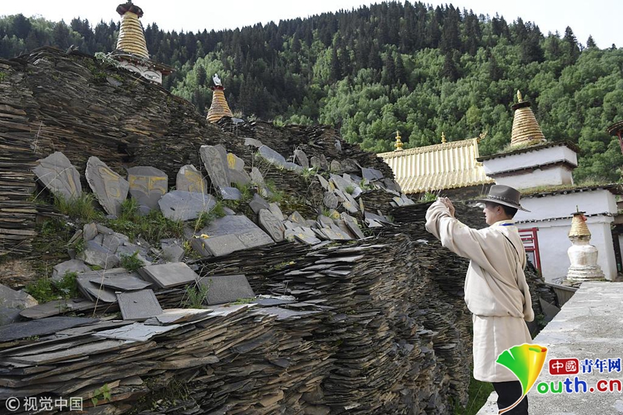 在四川阿壩州壤塘縣棒托寺內(nèi)珍藏約50萬(wàn)片明清時(shí)期鐫刻的大藏經(jīng)《甘珠爾》和《丹珠爾》,大藏經(jīng)左高9.7米,右高9.2米,長(zhǎng)46米、左寬160米,右寬13米,占地598平方米,是目前全世界保存最完整、規(guī)模最宏大、內(nèi)容最豐富的石刻大藏經(jīng)孤品。據(jù)史料記載,由明末清初60余名石匠辛勤鐫刻9年而成。石刻藏文經(jīng)書(shū)圖文并茂,筆法流暢,疏密有致,陰陽(yáng)相背,滿版生輝。具有極高的文物和藝術(shù)研究?jī)r(jià)值。圖為堆積的石刻大藏經(jīng)孤品。圖片作者/視覺(jué)中國(guó)