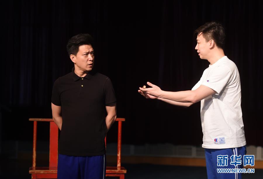 6月19日,扮演宋子文的張建峰(左)和扮演張?zhí)椎淖T正巖(右)在排練中。新華社記者 羅曉光 攝