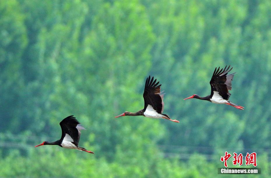 7月1日,河北石家莊平山崗南水庫下游滹沱河段發(fā)現(xiàn)成群黑鸛,最多時達(dá)12只,黑鸛是大型涉禽,屬國家一級保護(hù)動物,也是世界瀕危珍禽,已被《瀕危野生動植物國際貿(mào)易公約》列為瀕危物種。中新社發(fā)于英杰 攝