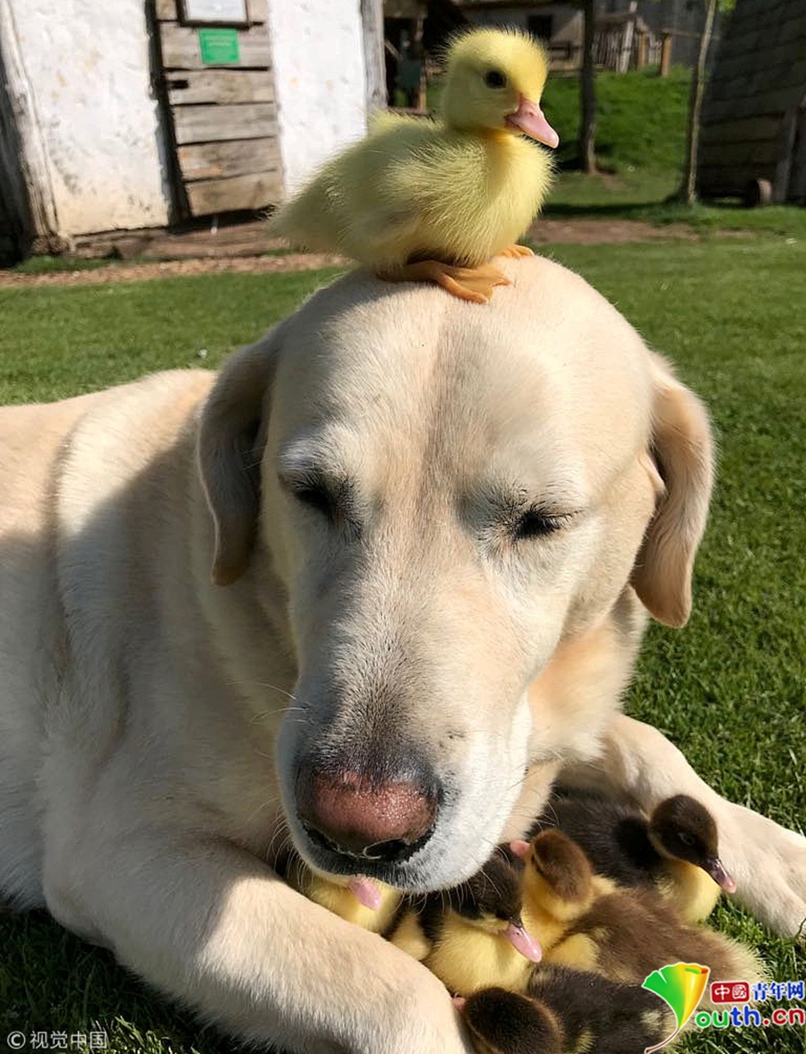 2018年5月22日訊(具體拍攝時(shí)間不詳),英國(guó)艾塞克斯郡芒特菲奇特城堡,一只名為弗雷德的拉布拉多和它“收養(yǎng)” 的9只小鴨子。小鴨子的媽媽突然失蹤,10歲的弗雷德就成了它們的“新爸爸”。圖片作者/視覺中國(guó)