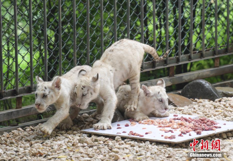 7月10日,雪虎五胞胎分享“肉餡蛋糕”。當(dāng)日,濟(jì)南野生動(dòng)物世界五胞胎雪虎誕生滿百日,正式與游客見面。中新社記者 張勇攝