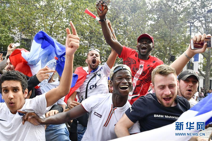 7月15日,法國球迷在巴黎香榭麗舍大街上慶祝法國隊(duì)奪冠。