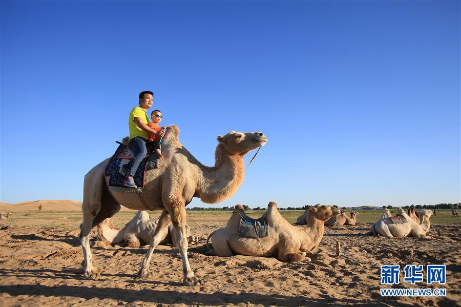 7月25日,一對(duì)父子在庫布其沙漠七星湖景區(qū)體驗(yàn)騎駱駝。