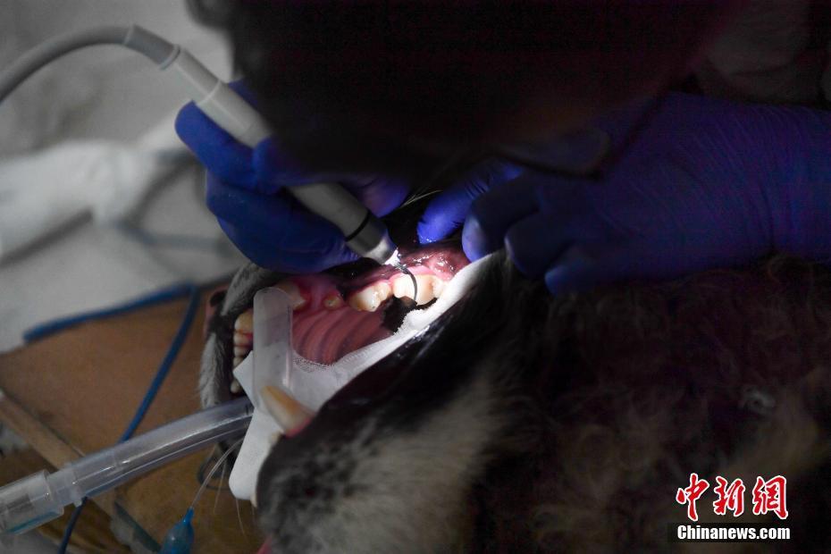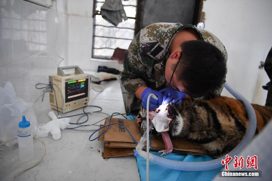 8月9日,獸醫(yī)使用洗牙機(jī)為老虎洗牙。當(dāng)日,位于昆明的云南野生動(dòng)物園獸醫(yī)通過(guò)呼吸麻醉的方式,為園中一只一歲的老虎清潔牙。中新社記者 劉冉陽(yáng) 攝
