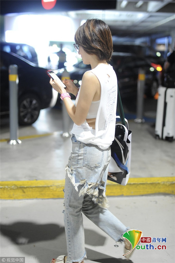 馬伊琍清爽白T小蠻腰隱現(xiàn) 破洞褲扮潮狂刷手機
