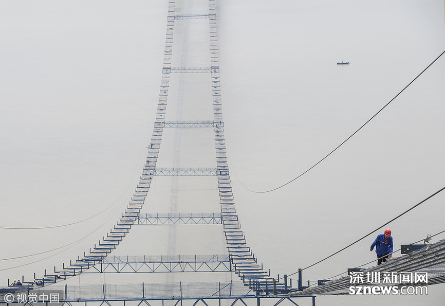 ???? 14日11時(shí)許,記者在228.8米高空建設(shè)現(xiàn)場(chǎng)感受到,高空風(fēng)力在6級(jí)上下,中跨、邊跨施工便道現(xiàn)場(chǎng)一片忙碌景象:班組長(zhǎng)雷承易帶著10余名工人或在用扳手錨緊貓道面網(wǎng)的扶手繩,或在鋪設(shè)鐵絲防護(hù)網(wǎng)……