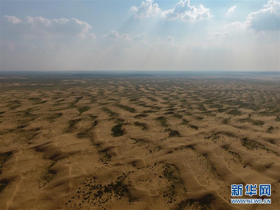 內(nèi)蒙古杭錦旗沙日召嘎查牧民白音道爾計治理過的庫布其沙漠(7月31日無人機拍攝)。 新華社記者邢廣利攝