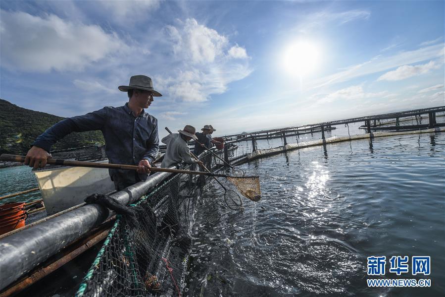 8月18日,南麂島海域的“海上牧場”養(yǎng)殖區(qū)內(nèi),漁民正捕撈大黃魚,處于仿生養(yǎng)殖環(huán)境的大黃魚需要生長2至3年。進入8月,浙江省溫州市平陽縣南麂鎮(zhèn)海域上大片的大黃魚、貽貝等特色海產(chǎn)品養(yǎng)殖區(qū)域迎來豐收季節(jié),養(yǎng)殖戶們駕駛漁船在養(yǎng)殖區(qū)海域進行打撈收獲,在碧海藍(lán)天下構(gòu)成了一幅“海上牧場”的美麗豐收景象。近年來,南麂鎮(zhèn)政府引導(dǎo)漁民養(yǎng)殖戶充分發(fā)揮“靠海吃海”的資源優(yōu)勢,大力發(fā)展海洋養(yǎng)殖經(jīng)濟和海島旅游經(jīng)濟,實現(xiàn)了南麂由“生態(tài)美”向“產(chǎn)業(yè)美”,“產(chǎn)業(yè)美”向“經(jīng)濟美”的轉(zhuǎn)變。同時該鎮(zhèn)堅持以大黃魚、貽貝等為特色產(chǎn)業(yè)支撐,精準(zhǔn)發(fā)展高效海洋養(yǎng)殖業(yè),重點培養(yǎng)一批新型職業(yè)漁民,依靠專業(yè)技術(shù)支持,實現(xiàn)深海仿生養(yǎng)殖,讓好生態(tài)造就好品質(zhì),重點打造南麂養(yǎng)殖品牌,組建營銷網(wǎng)絡(luò),拓展特色海產(chǎn)品市場。新華社記者 徐昱攝