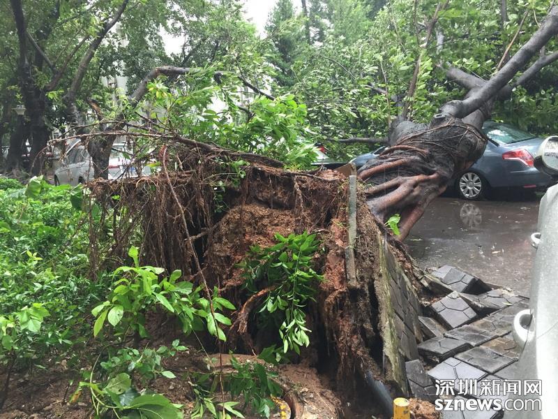 在蓮花北村靠近北環(huán)中學的小路,記者注意到拉起警戒線,有多株樹木經不住大風考驗,已投降就地倒下。