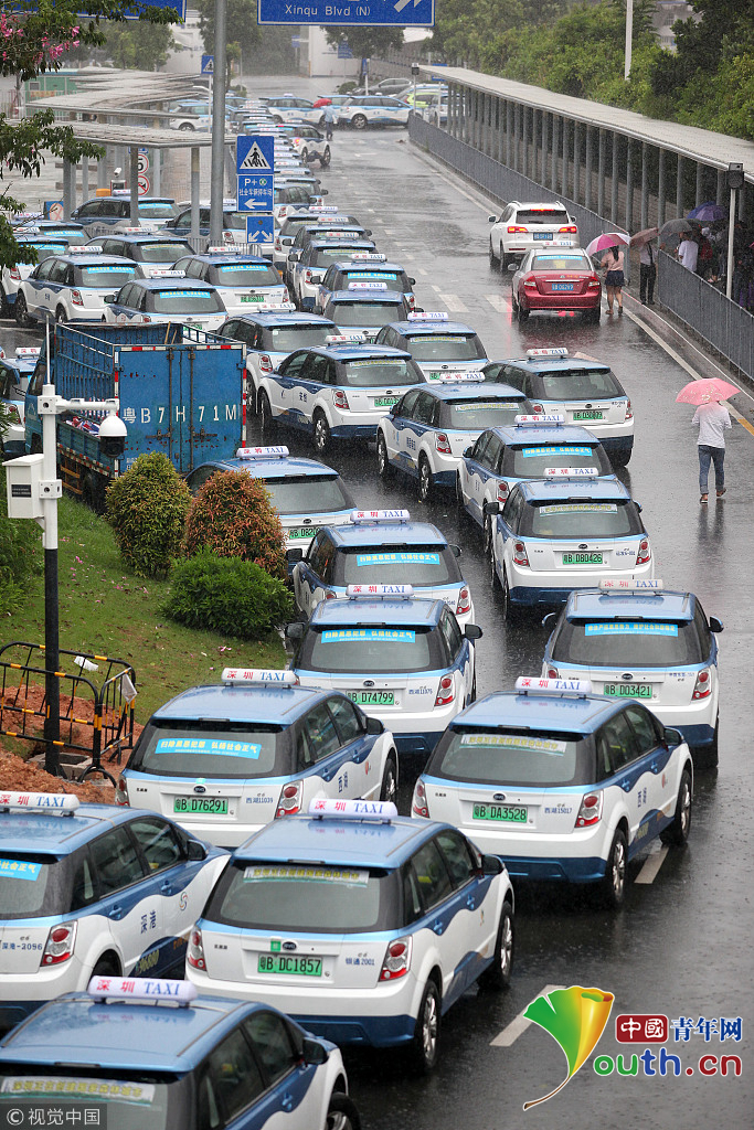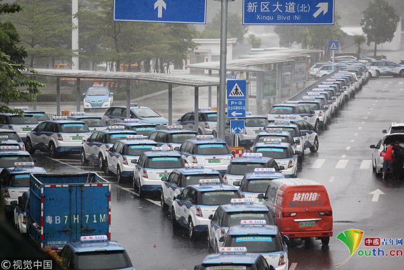 2018年9月16日,受臺風山竹影響,全市的電動車充電站暫停使用。深圳市民樂P+R停車場外,停滿了等待充電站開門的電動出租車。