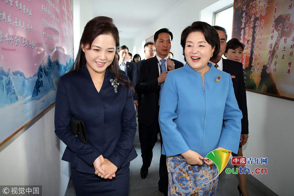 當?shù)貢r間2018年9月18日,朝鮮平壤,韓國總統(tǒng)文在寅夫人金正淑在朝鮮國務委員會委員長金正恩夫人李雪主的陪同下參觀平壤金元均音樂大學。圖片作者:視覺中國