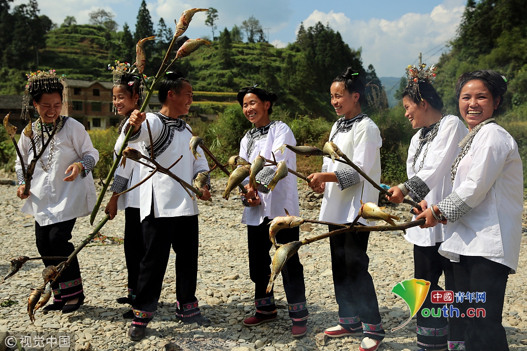 2016年9月17日,貴州省榕江縣平陽鄉(xiāng)硐里村七位侗家婦女們正燒魚。每年中秋時節(jié),當(dāng)?shù)囟弊逋_田放水,捉魚,全寨男女老少,野外生起篝火烤魚,用烤魚、米酒等,祭祀魚神,祈禱魚糧豐收的傳統(tǒng)民俗活動。