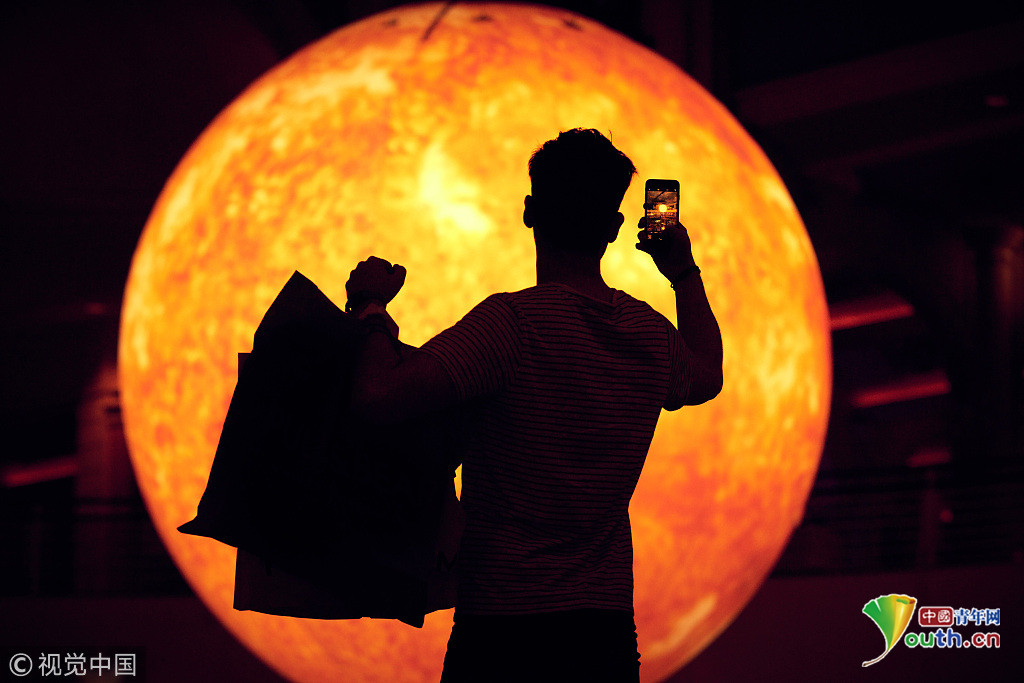 當(dāng)?shù)貢r(shí)間2018年9月18日,英國(guó)曼切斯特,顧客們?cè)谔乩5沦徫镏行牡囊粋€(gè)巨型的“太陽”下享受室內(nèi)日光浴,感受英國(guó)未完的史上最熱夏天。這個(gè)人造“太陽”的亮度相當(dāng)于1.2萬個(gè)燈泡。圖片來源:視覺中國(guó)