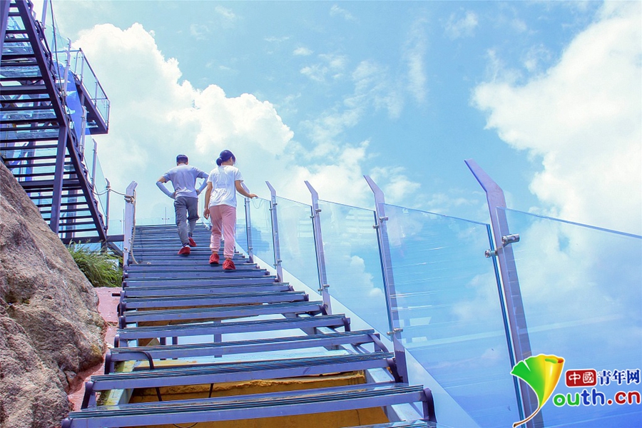 2018年8月,廣東清遠(yuǎn)。如今,玻璃橋、玻璃觀景臺(tái)、玻璃漂流道、玻璃滑道等玻璃產(chǎn)品可以說多如牛毛,琳瑯滿目。這些玻璃產(chǎn)品都是水平的,即使有坡度,也是借助工具滑下去的。小伙伴們是否挑戰(zhàn)體驗(yàn)過像樓梯一樣的玻璃天梯,階梯式攀向高處,直聳云宵,云霧飄渺。