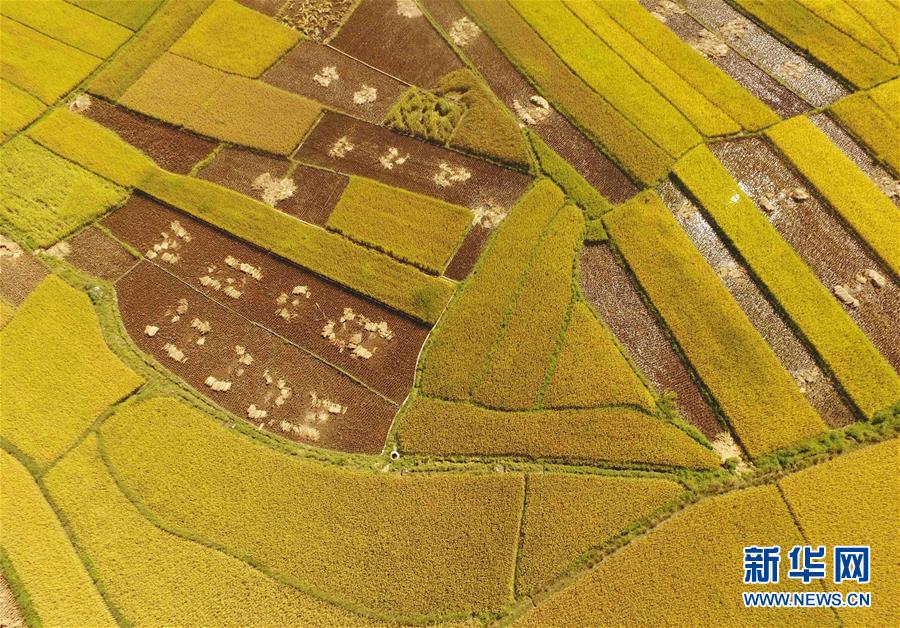 這是廣南縣八寶鎮(zhèn)壩龍村的稻田景色(9月20日無(wú)人機(jī)拍攝)。 云南省文山壯族苗族自治州廣南縣八寶鎮(zhèn)今年種植優(yōu)質(zhì)水稻22000余畝,秋收季節(jié),田野里一片金黃,景色如畫。 新華社記者楊宗友攝