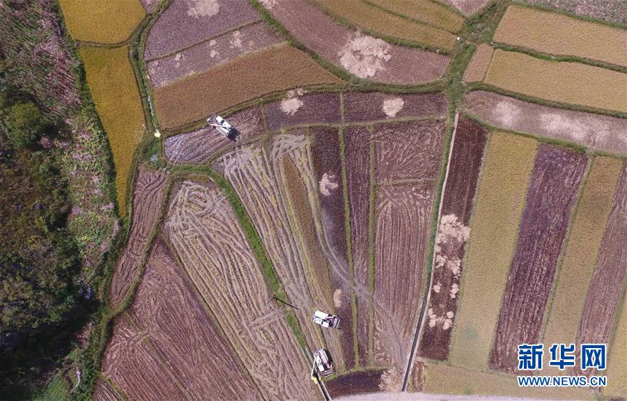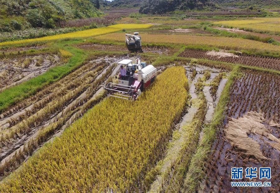 9月20日,廣南縣八寶鎮(zhèn)壩龍村的農(nóng)民在用收割機(jī)收稻谷(無(wú)人機(jī)拍攝)。 云南省文山壯族苗族自治州廣南縣八寶鎮(zhèn)今年種植優(yōu)質(zhì)水稻22000余畝,秋收季節(jié),田野里一片金黃,景色如畫(huà)。 新華社記者楊宗友攝