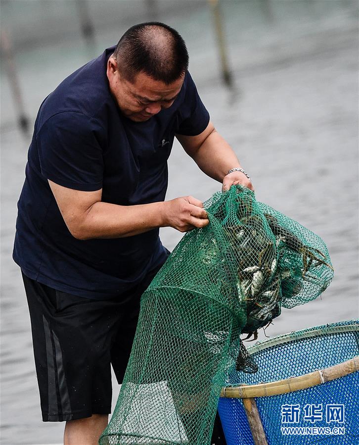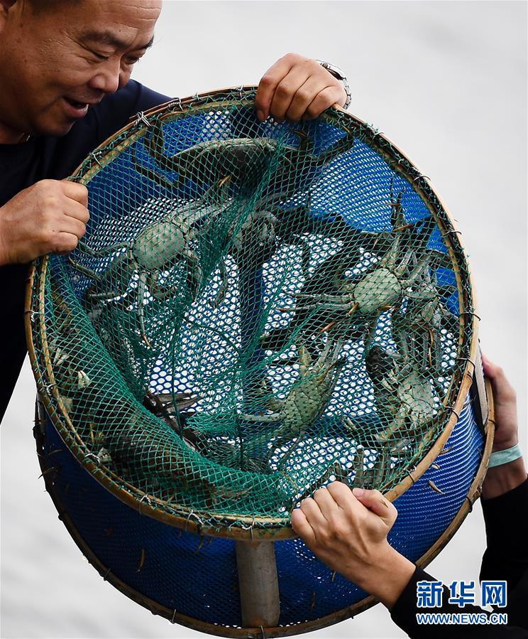 9月21日,蟹農(nóng)展示剛捕撈到的陽澄湖大閘蟹。
