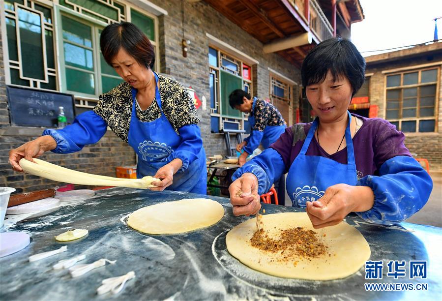 9月22日,段河村村民段粉拽(右前)在往月餅皮里放餡料。 中秋節(jié)來臨之際,山西省晉城市澤州縣南嶺鄉(xiāng)段河村的段富善一家人忙碌起來,他們家制作的“柴火月餅”遠(yuǎn)近聞名。 “柴火月餅”起源于明清時(shí)期,餡料以糖搭配花生仁、芝麻、玫瑰等,有近10道制作工序,其中最有特色的是木柴烤制工藝,烘烤師傅必須掌握好火候,才能烤出外皮酥脆、餡料飄香的月餅。 新華社記者 曹陽 攝