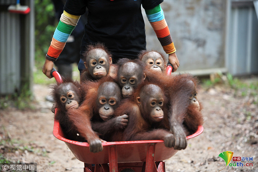 印尼動物救援中心里 猩猩寶寶擠“校車”“上學(xué)”超萌