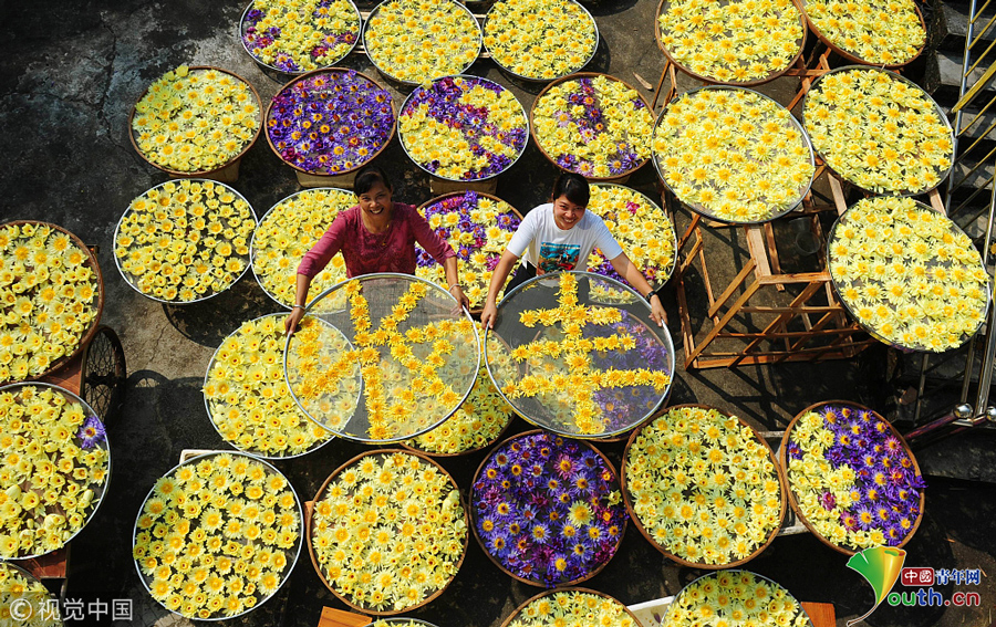 2018年9月23日,廣西柳州,柳北區(qū)石碑坪鎮(zhèn)下陶村的農民覃向鮮和鄰居一起用已經晾曬干了的九品香蓮擺出“豐收“字樣。圖片作者:陳健明