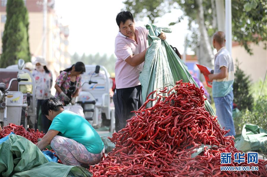 9月16日,阜城縣王集鄉(xiāng)南張莊村農(nóng)民在整理收獲的辣椒。近年來,河北省阜城縣王集鄉(xiāng)在推進產(chǎn)業(yè)富民過程中,積極引導農(nóng)民調(diào)整農(nóng)業(yè)產(chǎn)業(yè)結構,按照品種特色化、種植規(guī)?;?、產(chǎn)銷一體化的“公司+基地+農(nóng)戶”的經(jīng)營模式,鼓勵農(nóng)民發(fā)展特色辣椒種植,推行“訂單種植”模式,開辟出了一條農(nóng)民創(chuàng)收新路徑。目前,阜城縣王集鄉(xiāng)辣椒種植面積3100余畝,每畝年收益2500元以上,帶動當?shù)剞r(nóng)民實現(xiàn)增收。新華社記者朱旭東攝