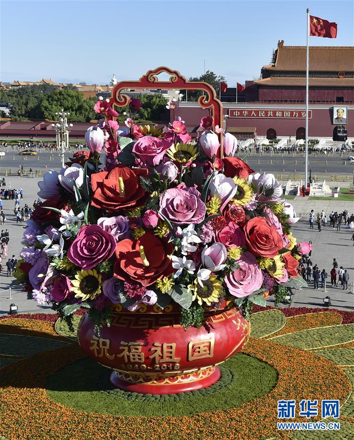 9月23日上午,天安門廣場“祝福祖國”大花籃組裝完成,展現(xiàn)在游客面前。花壇頂高17米,底部直徑50米,花籃里插放有紅掌、梅花、康乃馨、向日葵、蘭花、月季等富有吉祥寓意的仿真花朵,花籃里最重要的花被稱為“焦點花”,在東南西北四個方向各一枝。另外頂部還有一枝,是整個花籃里尺寸最大的。以往一般選擇中國傳統(tǒng)花材——牡丹作為焦點花,今年為了慶祝改革開放40周年,首次選用紅掌,并用許多紅掌組合成一朵大花。最大的一朵直徑達到4米左右,重達150公斤,用形如紅心的紅掌組合而成,寓意紅心向黨、團結(jié)凝聚在一起。