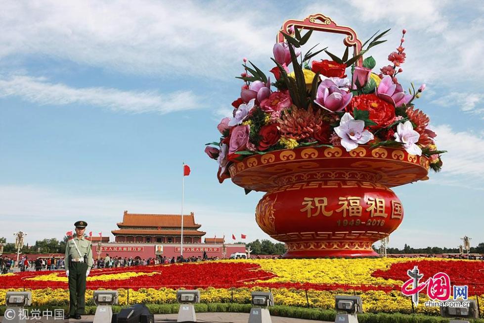 昨天,不少游客在天安門廣場前駐足拍照。經(jīng)過一周多時間的日夜奮戰(zhàn),“祝福祖國”巨型花籃組裝完成。北京青年報從市園林綠化局獲悉,自2011年開始,“祝福祖國”巨型花籃就一直作為廣場中心花壇,在國慶節(jié)期間向祖國獻禮。今年花籃為鋼架結(jié)構(gòu),籃身為玻璃鋼材質(zhì),可抗10級風?;@體南側(cè)書寫“祝福祖國,1949-2018”,籃體北側(cè)書寫“歡度國慶,1949-2018”。