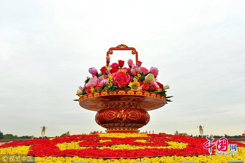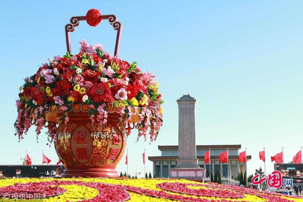昨天(23日)上午,天安門廣場“祝福祖國”大花籃組裝完成,展現(xiàn)在游客面前?;▔敻?7米,底部直徑50米,花籃里插放大量富有吉祥寓意的仿真花朵,最大的一朵直徑達到4米左右,重達150公斤,用形如紅心的紅掌組合而成,寓意紅心向黨、團結(jié)凝聚在一起。天安門廣場兩側(cè)綠地上設(shè)置了12根花柱、18個花球及3800平方米花帶。