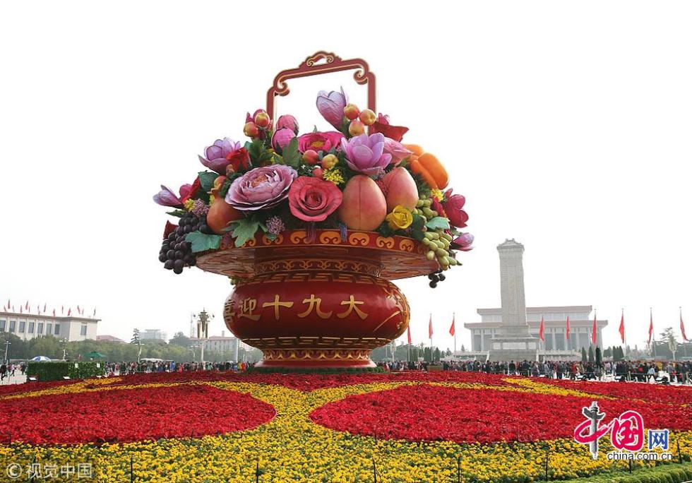 2017年天安門廣場大花籃以喜慶的花果籃為主景,花籃頂高17米,籃體高15.3米,底部直徑達50米?;@體南側(cè)寫有“祝福祖國、1949-2017”,北側(cè)寫有“喜迎十九大” 字樣?;ü@內(nèi)共使用主花56朵(牡丹、月季、玉蘭、金桂、迎春花、蘋果花、紫藤花、文心蘭、葉子花),其中最大牡丹直徑3.2米,果實6種(石榴、桃、柿子、蘋果、海棠、葡萄)。寓意吉祥的果實和花卉,象征十八大以來,黨和國家在各個領(lǐng)域取得的輝煌成就,碩果累累。底部花壇采用心形圖案,寓意紅心向黨,象征著全國人民緊密團結(jié)在以習近平同志為核心的黨中央周圍,表達對祖國繁榮富強、欣欣向榮的美好祝福。