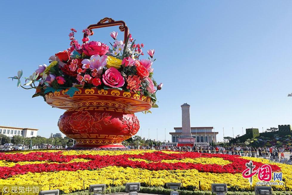2011年10月04日,在北京蔚藍的天空下,“祝福祖國”的大型花壇屹立在天安門廣場中央。蘇陽攝影
