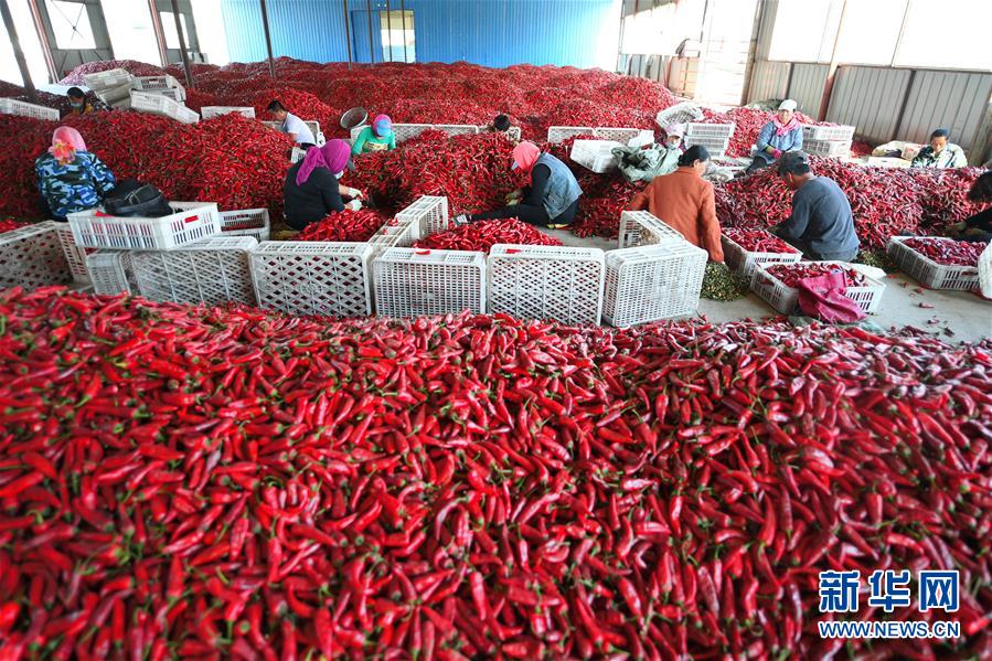 9月16日,阜城縣王集鄉(xiāng)南張莊村農(nóng)民在整理收獲的辣椒。近年來(lái),河北省阜城縣王集鄉(xiāng)在推進(jìn)產(chǎn)業(yè)富民過(guò)程中,積極引導(dǎo)農(nóng)民調(diào)整農(nóng)業(yè)產(chǎn)業(yè)結(jié)構(gòu),按照品種特色化、種植規(guī)?;?、產(chǎn)銷(xiāo)一體化的“公司+基地+農(nóng)戶”的經(jīng)營(yíng)模式,鼓勵(lì)農(nóng)民發(fā)展特色辣椒種植,推行“訂單種植”模式,開(kāi)辟出了一條農(nóng)民創(chuàng)收新路徑。目前,阜城縣王集鄉(xiāng)辣椒種植面積3100余畝,每畝年收益2500元以上,帶動(dòng)當(dāng)?shù)剞r(nóng)民實(shí)現(xiàn)增收。新華社記者朱旭東攝