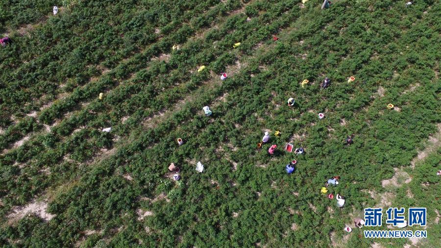 9月16日,阜城縣王集鄉(xiāng)南張莊村農(nóng)民在采摘辣椒(無(wú)人機(jī)拍攝)。近年來(lái),河北省阜城縣王集鄉(xiāng)在推進(jìn)產(chǎn)業(yè)富民過(guò)程中,積極引導(dǎo)農(nóng)民調(diào)整農(nóng)業(yè)產(chǎn)業(yè)結(jié)構(gòu),按照品種特色化、種植規(guī)模化、產(chǎn)銷(xiāo)一體化的“公司+基地+農(nóng)戶”的經(jīng)營(yíng)模式,鼓勵(lì)農(nóng)民發(fā)展特色辣椒種植,推行“訂單種植”模式,開(kāi)辟出了一條農(nóng)民創(chuàng)收新路徑。目前,阜城縣王集鄉(xiāng)辣椒種植面積3100余畝,每畝年收益2500元以上,帶動(dòng)當(dāng)?shù)剞r(nóng)民實(shí)現(xiàn)增收。新華社記者朱旭東攝