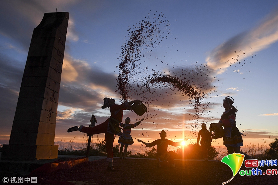 9月26日,長(zhǎng)三角第一高峰浙江龍泉山農(nóng)作物喜獲豐收,當(dāng)?shù)剞r(nóng)民與游客用8噸剛收獲的辣椒以及玉米,在山頂?shù)脑坪V衅闯隽艘幻骈L(zhǎng)10米、寬6.6米的巨型國(guó)旗慶祝豐收。