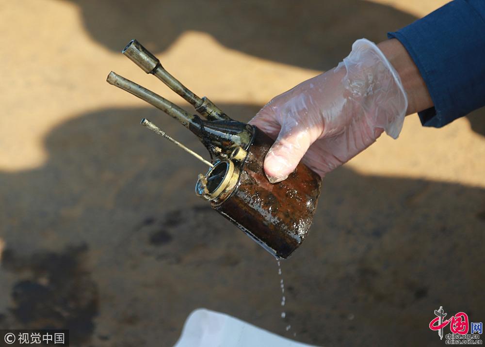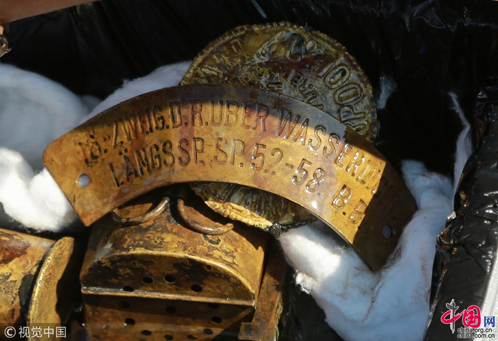 2018年9月25日,遼寧大連,在莊河黑島海域甲午戰(zhàn)爭(zhēng)“經(jīng)遠(yuǎn)艦”遺址出水的各類遺物標(biāo)本。視覺中國(guó)