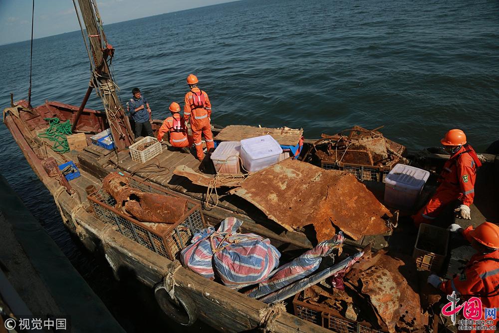 2018年9月25日,遼寧大連,考古工作人員把出水的經(jīng)遠(yuǎn)艦遺物進(jìn)行轉(zhuǎn)運(yùn)。視覺中國(guó)