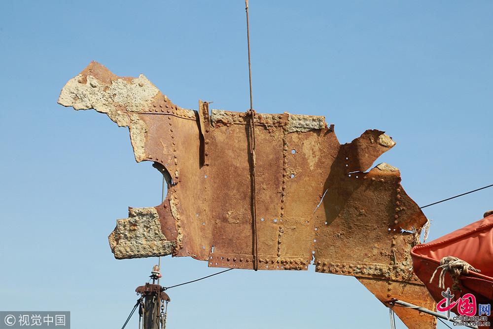 2018年9月25日,遼寧大連,考古工作人員把一片“經(jīng)遠(yuǎn)艦”裝甲進(jìn)行吊裝轉(zhuǎn)運(yùn)。視覺中國(guó)