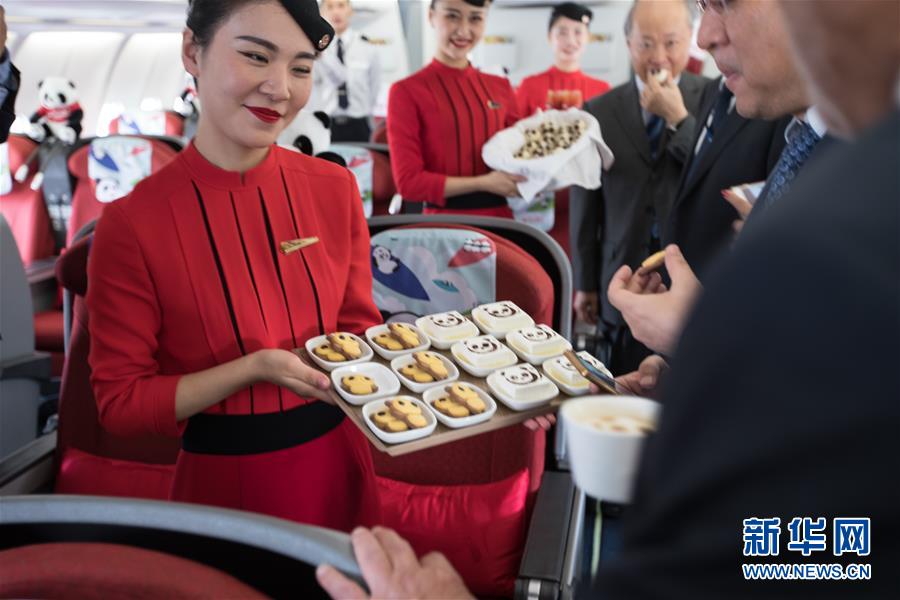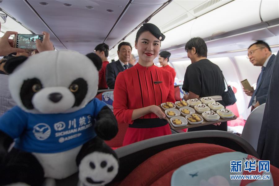9月26日,在以色列特拉維夫本·古里安國際機(jī)場,四川航空公司空乘人員在機(jī)上展示熊貓主題的小吃。  新華社記者郭昱攝