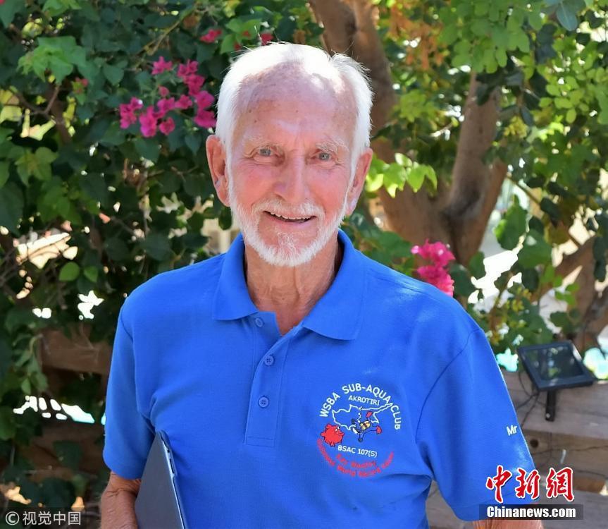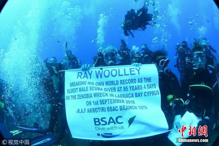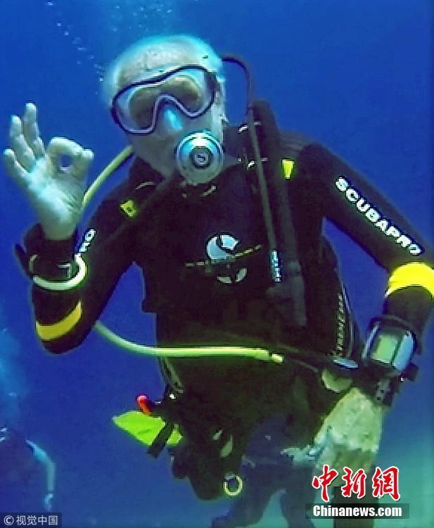 當(dāng)?shù)貢r(shí)間2018年9月1日,塞浦路斯,95歲的英國潛水員雷·伍利(Ray Woolley)以44分鐘下潛40.5米的成績(jī)打破了自己94歲達(dá)成的記錄(41分鐘下潛38.1米),二度刷新了世界上年齡最大的男性潛水員最好成績(jī)。在此次下潛中,這位二戰(zhàn)退伍老兵對(duì)距塞浦路斯南部城鎮(zhèn)拉納卡約2公里處的海域進(jìn)行了探索,1980年一艘名為“芝諾比亞號(hào)”(Zenobia)的貨船在這里進(jìn)行首次航行時(shí)沉沒。圖片來源:視覺中國