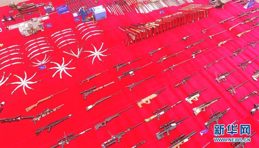 9月20日,非法槍支等物品在全國(guó)公安機(jī)關(guān)集中統(tǒng)一銷毀非法槍爆物品活動(dòng)重慶現(xiàn)場(chǎng)展示(無(wú)人機(jī)拍攝)。 新華社記者 王全超 攝