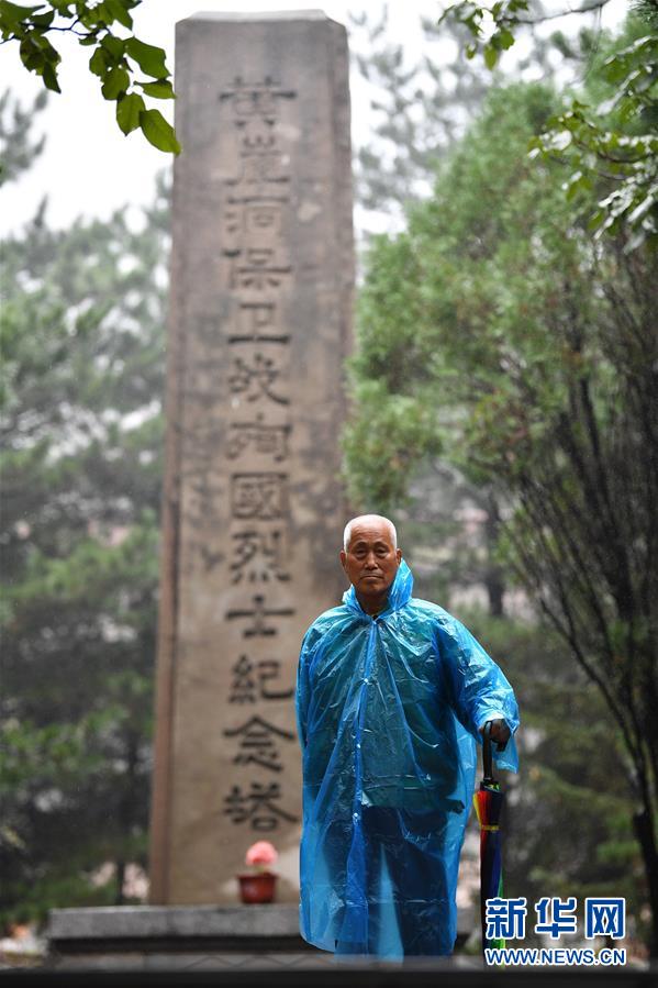 在黃崖洞烈士陵園,趙乃堂在黃崖洞保衛(wèi)戰(zhàn)殉國烈士紀念塔前(9月18日攝)。