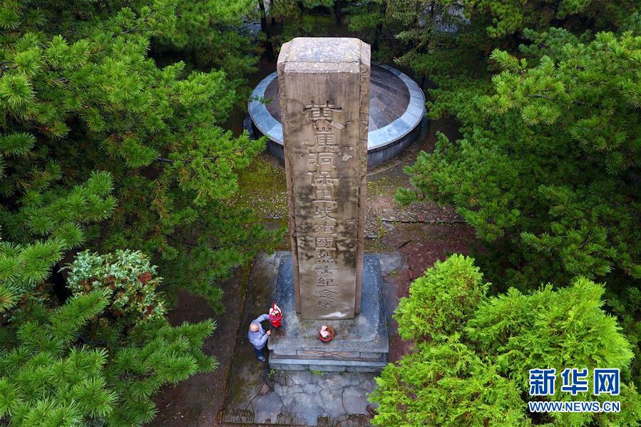 在黃崖洞烈士陵園,趙乃堂將花擺在黃崖洞保衛(wèi)戰(zhàn)殉國(guó)烈士紀(jì)念塔前(9月19日無人機(jī)拍攝)。 新華社記者 詹彥 攝
