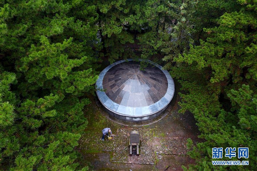 趙乃堂在黃崖洞烈士陵園內(nèi)打掃(9月19日無人機(jī)拍攝)。 新華社記者 詹彥 攝