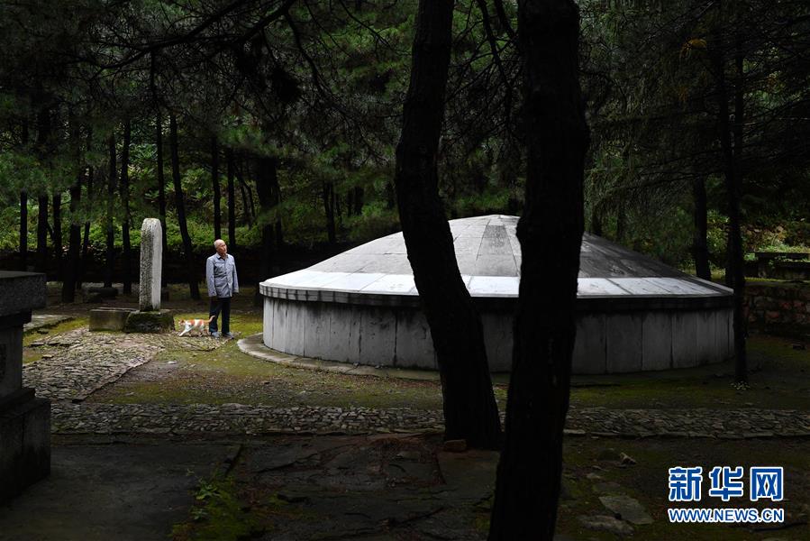 趙乃堂在打掃黃崖洞烈士陵園(9月20日攝)。 新華社記者 詹彥 攝