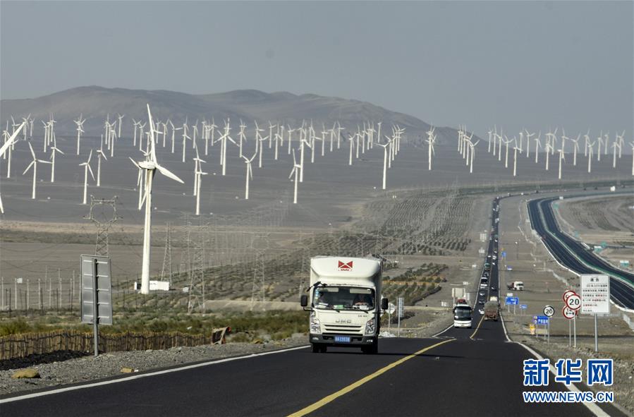 汽車行駛在新疆吐魯番市郊區(qū)風力發(fā)電場一旁的公路上(9月22日攝)。新華社記者趙戈 攝