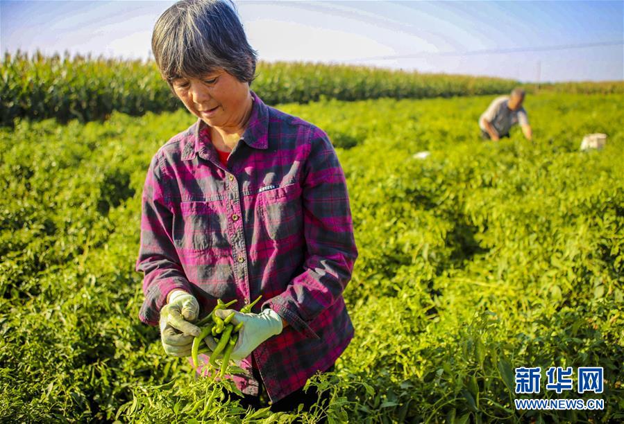 9月28日,饒陽(yáng)縣留楚鄉(xiāng)影林村的種植戶在摘辣椒。 近年來(lái),河北省饒陽(yáng)縣結(jié)合市場(chǎng)需求,積極引進(jìn)特色品種辣椒種植,開(kāi)辟出一條農(nóng)民增收致富新路。目前,該縣特色辣椒種植面積1000余畝,種植戶年均增收3000余元。 新華社記者 李曉果攝