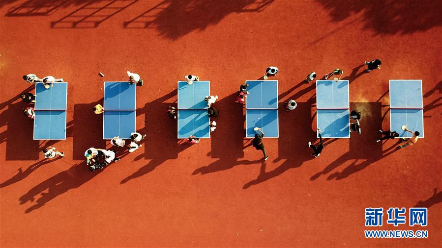 學生在安徽鳳陽小崗村小崗學校內(nèi)打乒乓球(9月26日無人機拍攝)。 新華社記者 張端攝